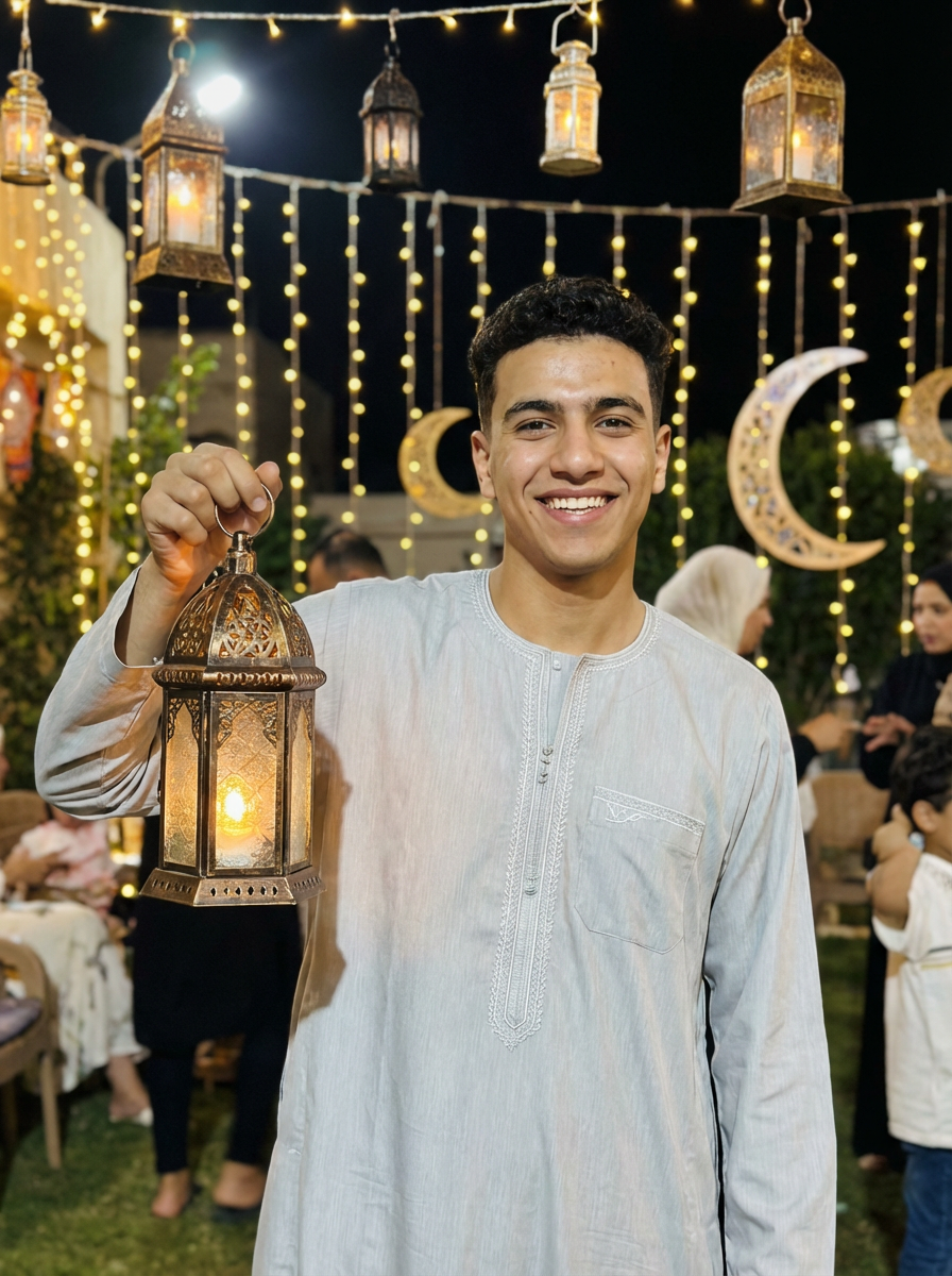 a stunning model celebrating Ramadan, surrounded by traditional lanterns and fairy lights, wearing a traditional thobe or kurta, with crescent moon decorations in the background