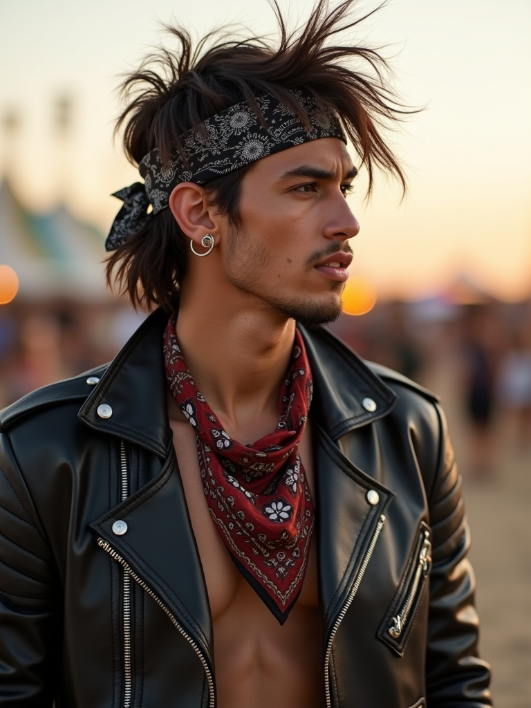 a stunning model in a leather jacket and bandana, embodying the fusion of bohemian and rock styles that define Coachella fashion