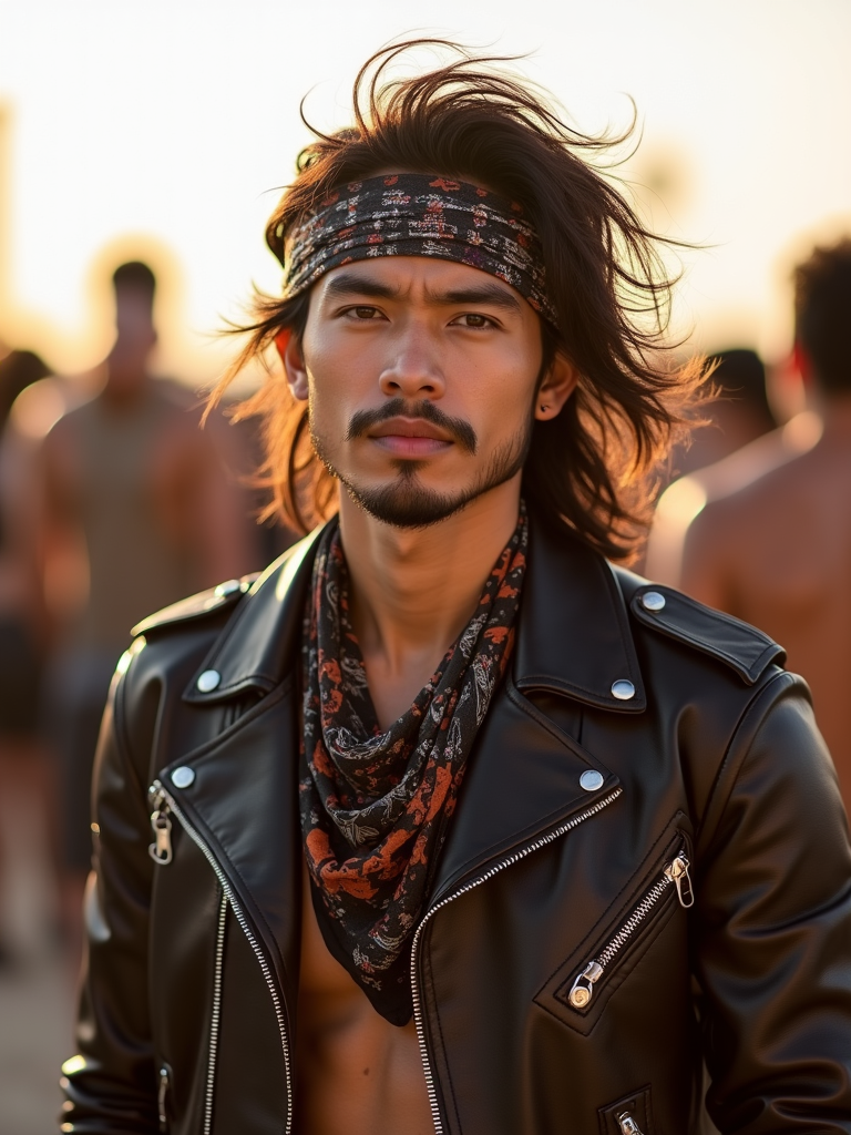 a stunning model in a leather jacket and bandana, embodying the fusion of bohemian and rock styles that define Coachella fashion