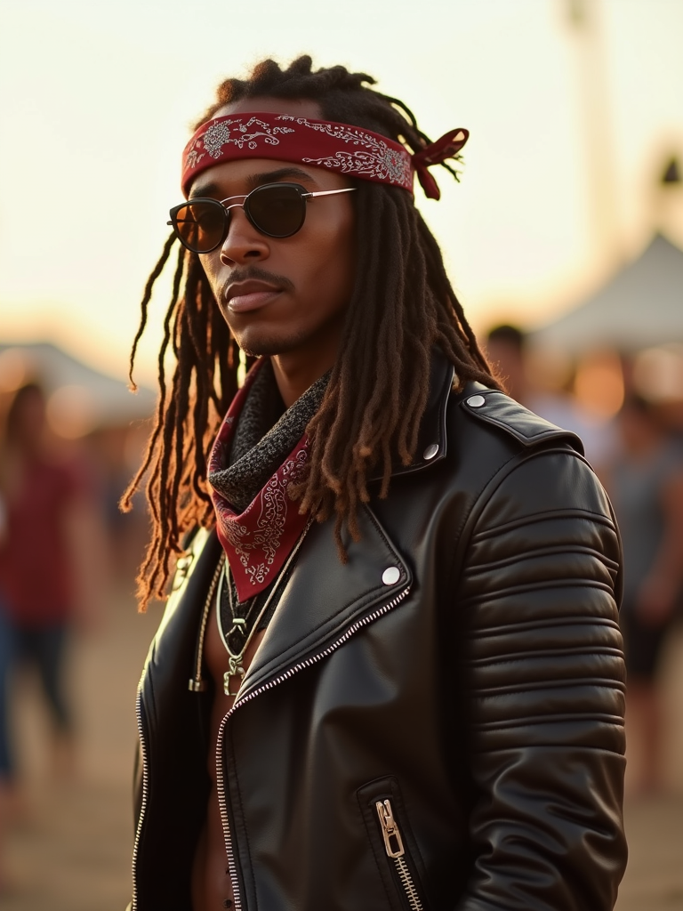 a stunning model in a leather jacket and bandana, embodying the fusion of bohemian and rock styles that define Coachella fashion