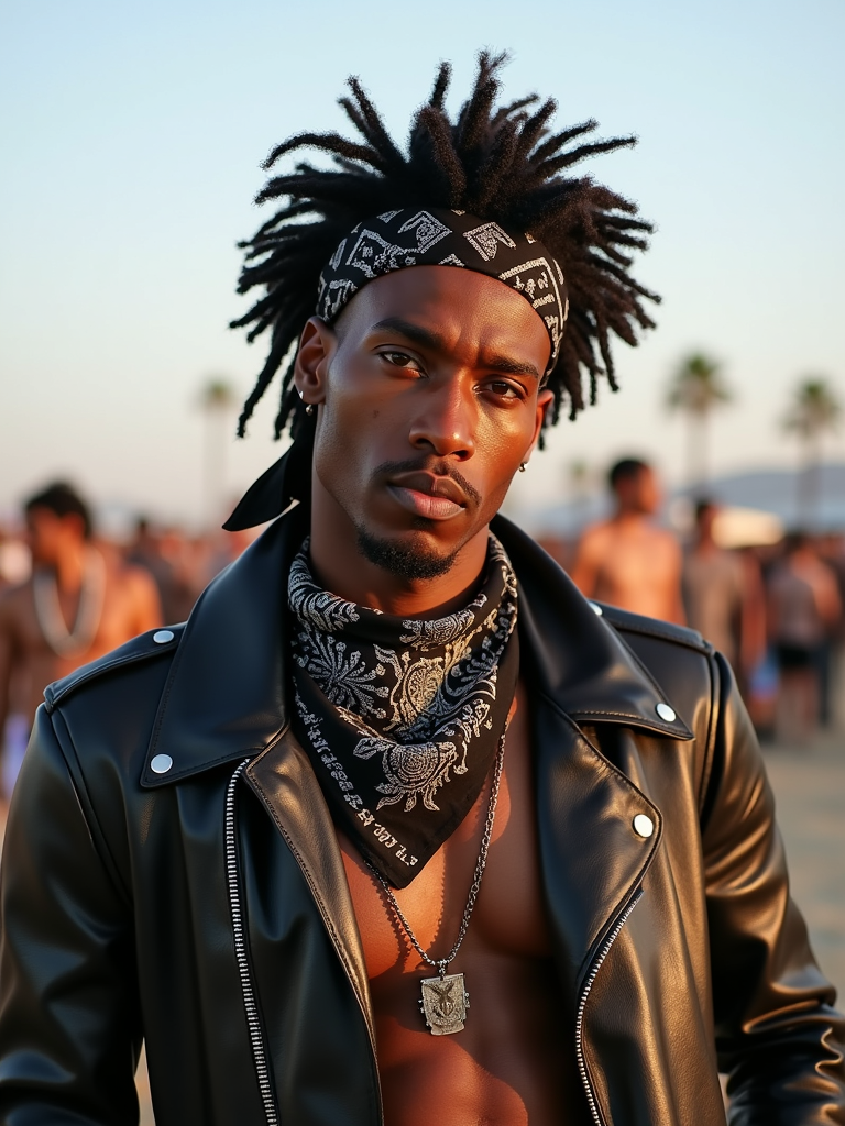 a stunning model in a leather jacket and bandana, embodying the fusion of bohemian and rock styles that define Coachella fashion