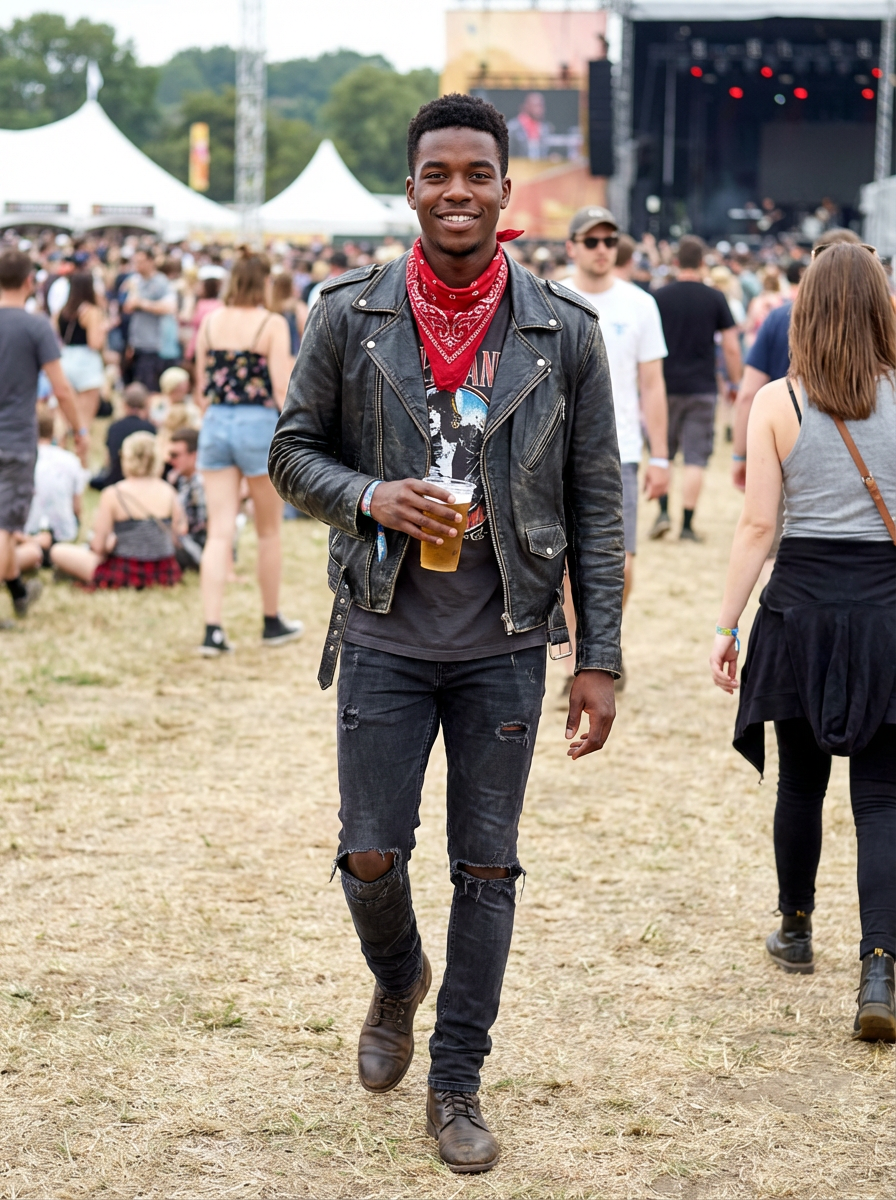 a stunning model in a leather jacket and bandana, embodying the fusion of bohemian and rock n roll styles at the festival