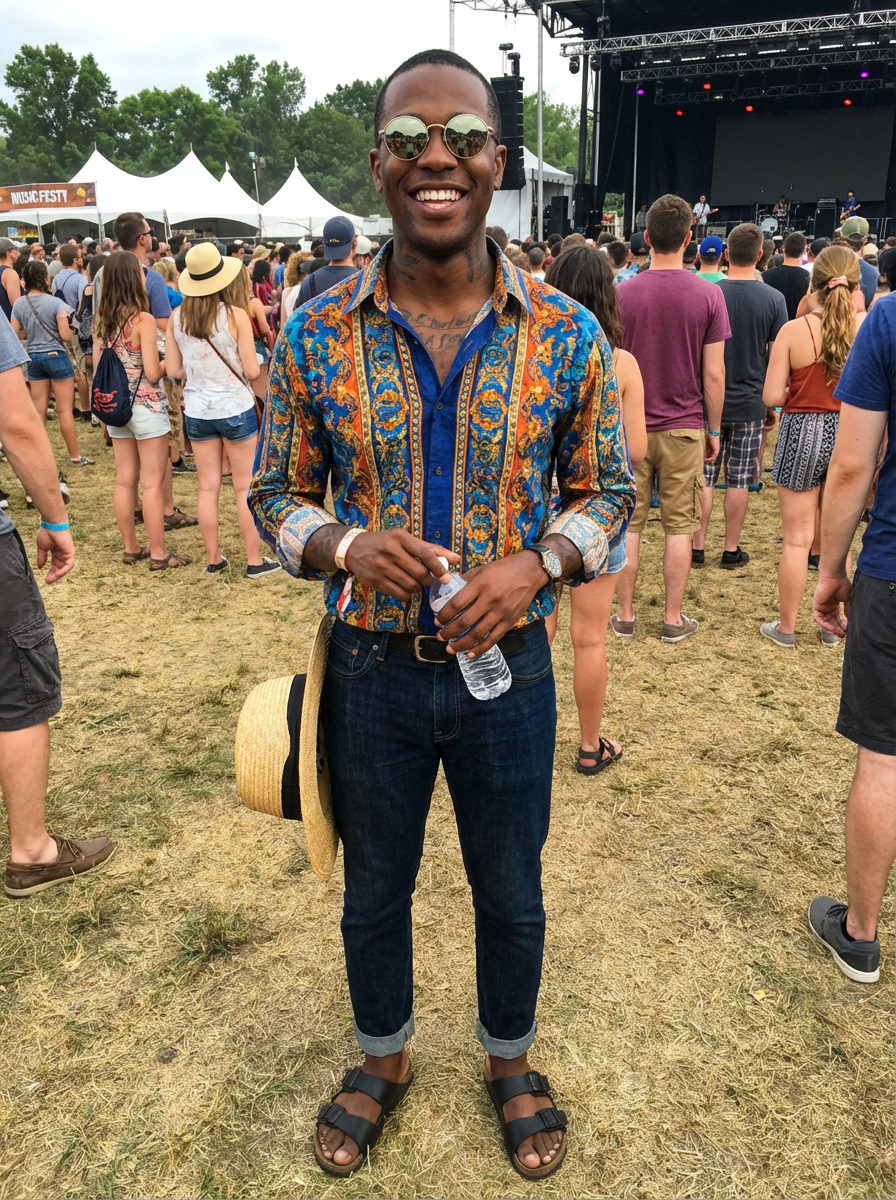 a stunning model in a vibrant button-up shirt and funky sunglasses, capturing their eclectic and fashionable festival look