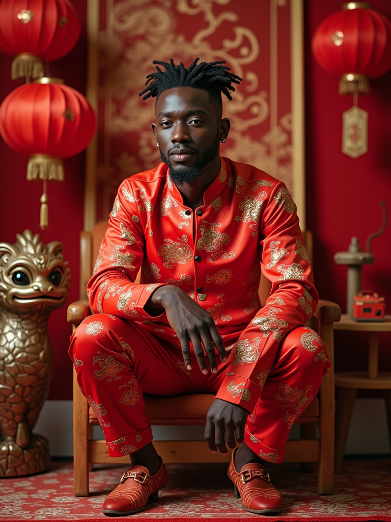a stunning model in contemporary fashion with traditional Chinese touches, capturing their festive look against a backdrop of Chinese zodiac symbols and Chinese New Year decorations