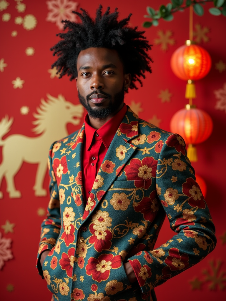 a stunning model in contemporary fashion with traditional Chinese touches, capturing their festive look against a backdrop of Chinese zodiac symbols and Chinese New Year decorations