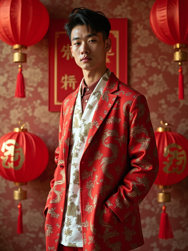 a stunning model in contemporary fashion with traditional Chinese touches, capturing their festive look against a backdrop of Chinese zodiac symbols and Chinese New Year decorations