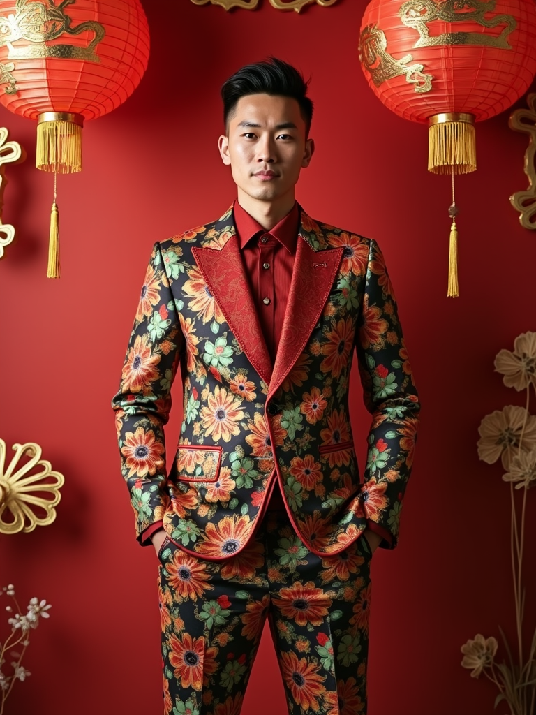 a stunning model in contemporary fashion with traditional Chinese touches, capturing their festive look against a backdrop of Chinese zodiac symbols and Chinese New Year decorations