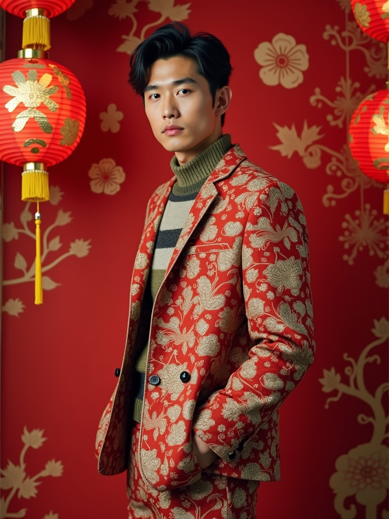 a stunning model in contemporary fashion with traditional Chinese touches, capturing their festive look against a backdrop of Chinese zodiac symbols and Chinese New Year decorations