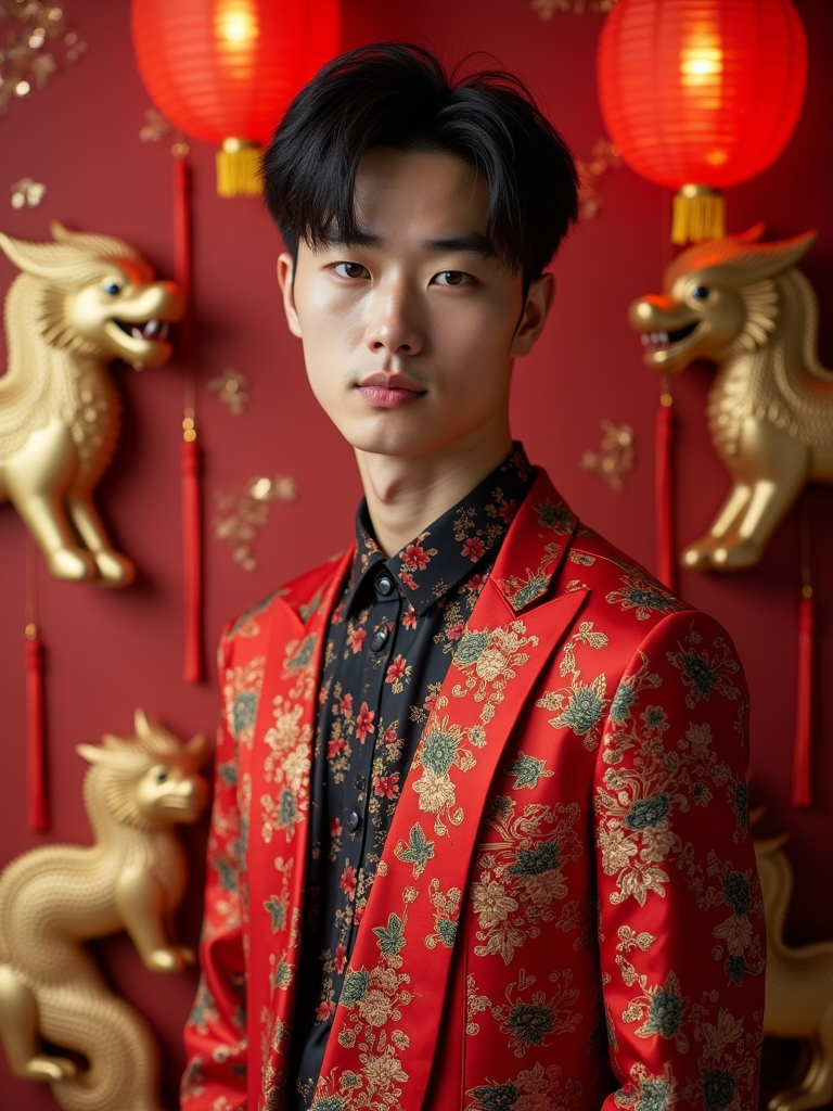 a stunning model in contemporary fashion with traditional Chinese touches, capturing their festive look against a backdrop of Chinese zodiac symbols and Chinese New Year decorations