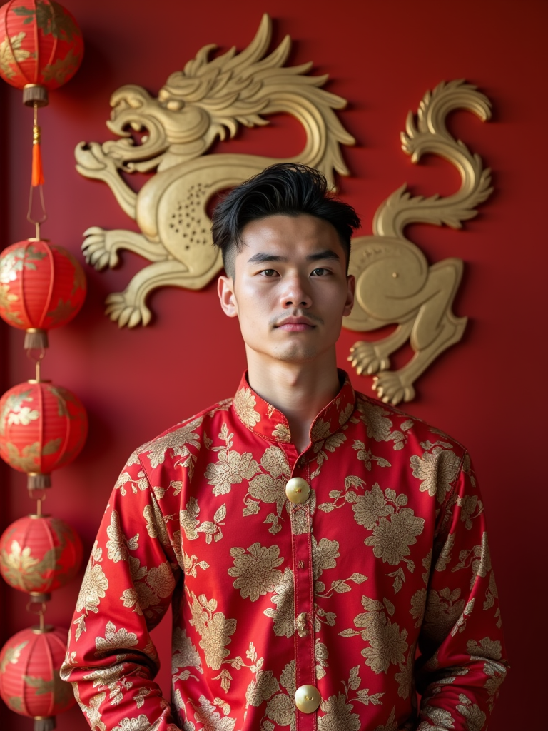 a stunning model in contemporary fashion with traditional Chinese touches, capturing their festive look against a backdrop of Chinese zodiac symbols and Chinese New Year decorations