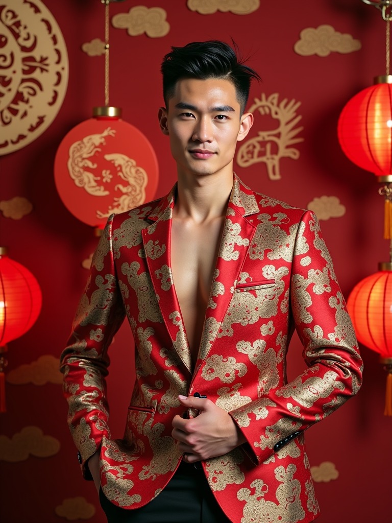 a stunning model in contemporary fashion with traditional Chinese touches, capturing their festive look against a backdrop of Chinese zodiac symbols and Chinese New Year decorations