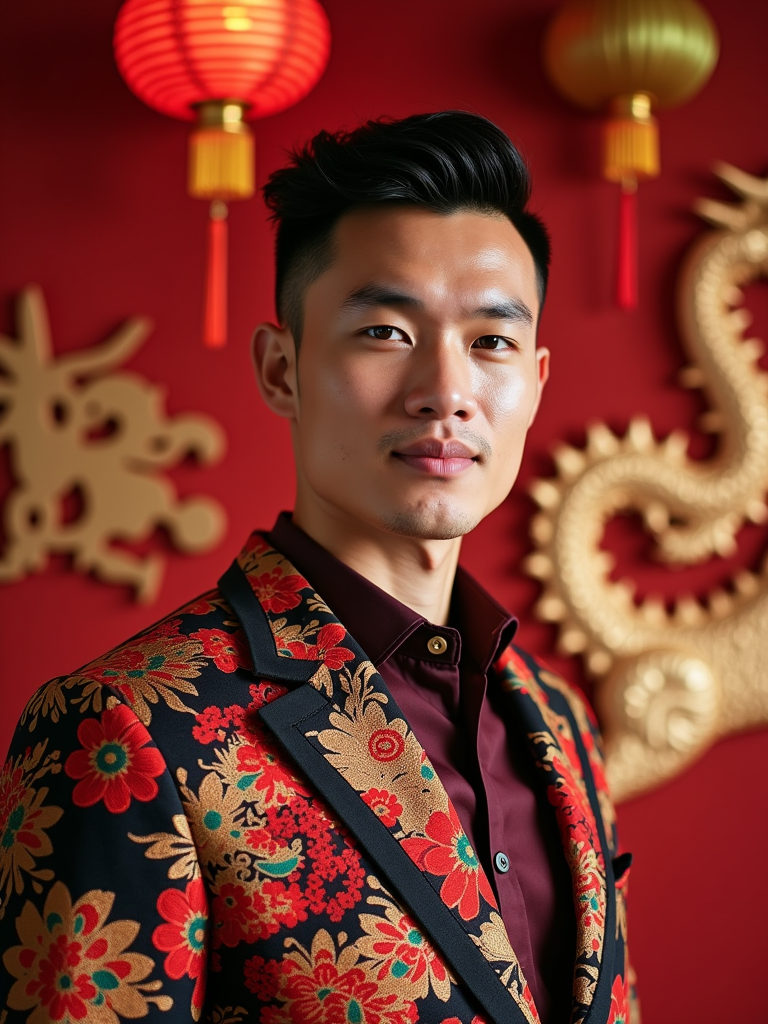 a stunning model in contemporary fashion with traditional Chinese touches, capturing their festive look against a backdrop of Chinese zodiac symbols and Chinese New Year decorations