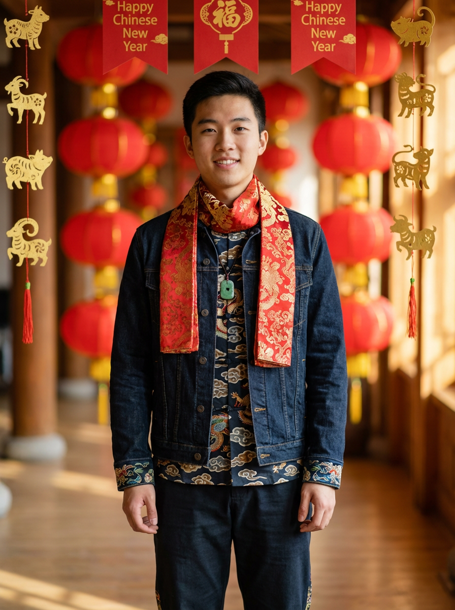 a stunning model in contemporary fashion with traditional Chinese touches, capturing their festive look against a backdrop of Chinese zodiac symbols and Chinese New Year decorations