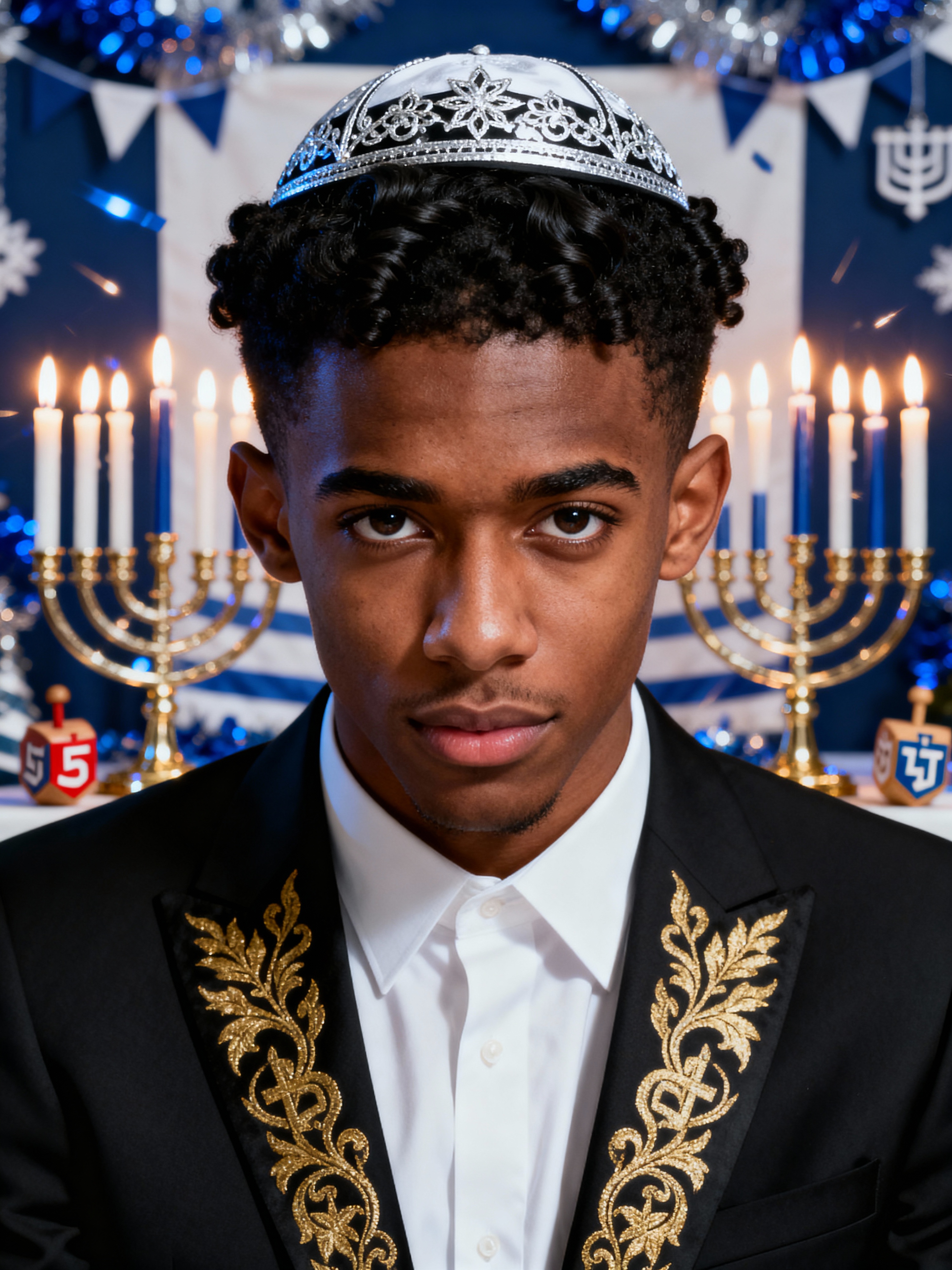 a stunning model in contemporary fashion with traditional Jewish touches, capturing their festive look against a backdrop of Hanukkah symbols and decorations