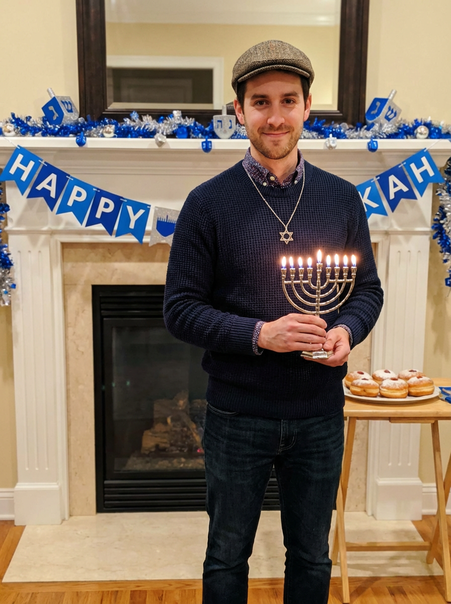 a stunning model in contemporary fashion with traditional Jewish touches, capturing their festive look against a backdrop of Hanukkah symbols and decorations