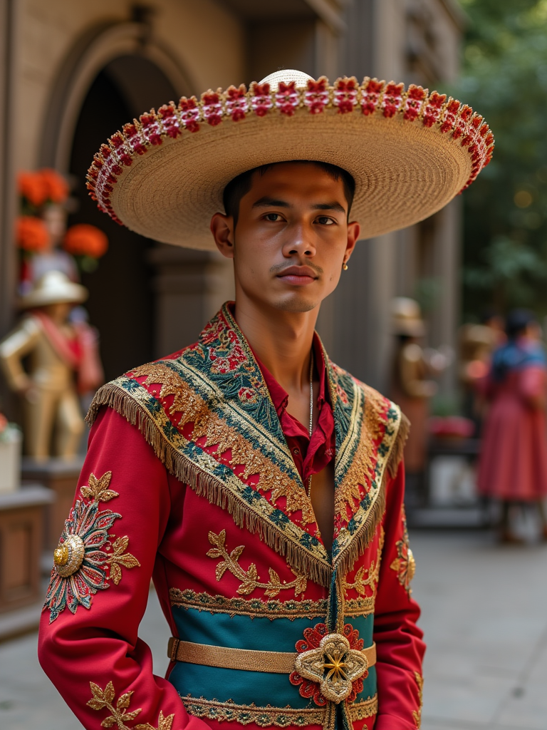a stunning model in contemporary fashion with traditional Mexican touches, capturing their festive look against a backdrop of altars and memorial decorations