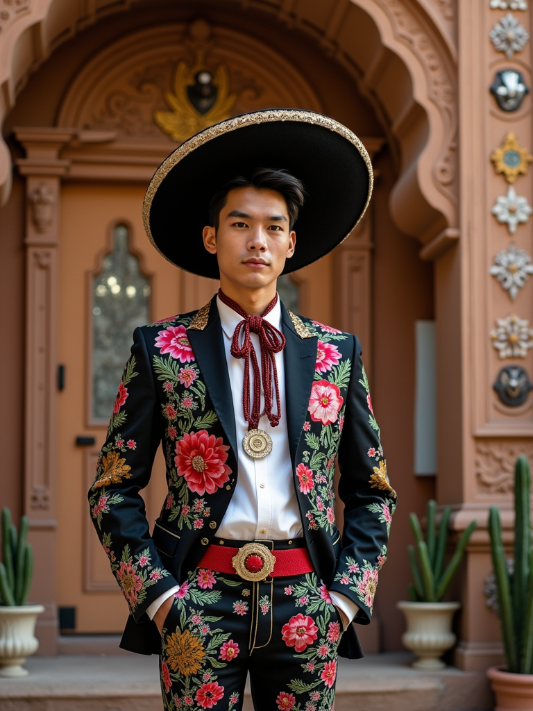 a stunning model in contemporary fashion with traditional Mexican touches, capturing their festive look against a backdrop of altars and memorial decorations
