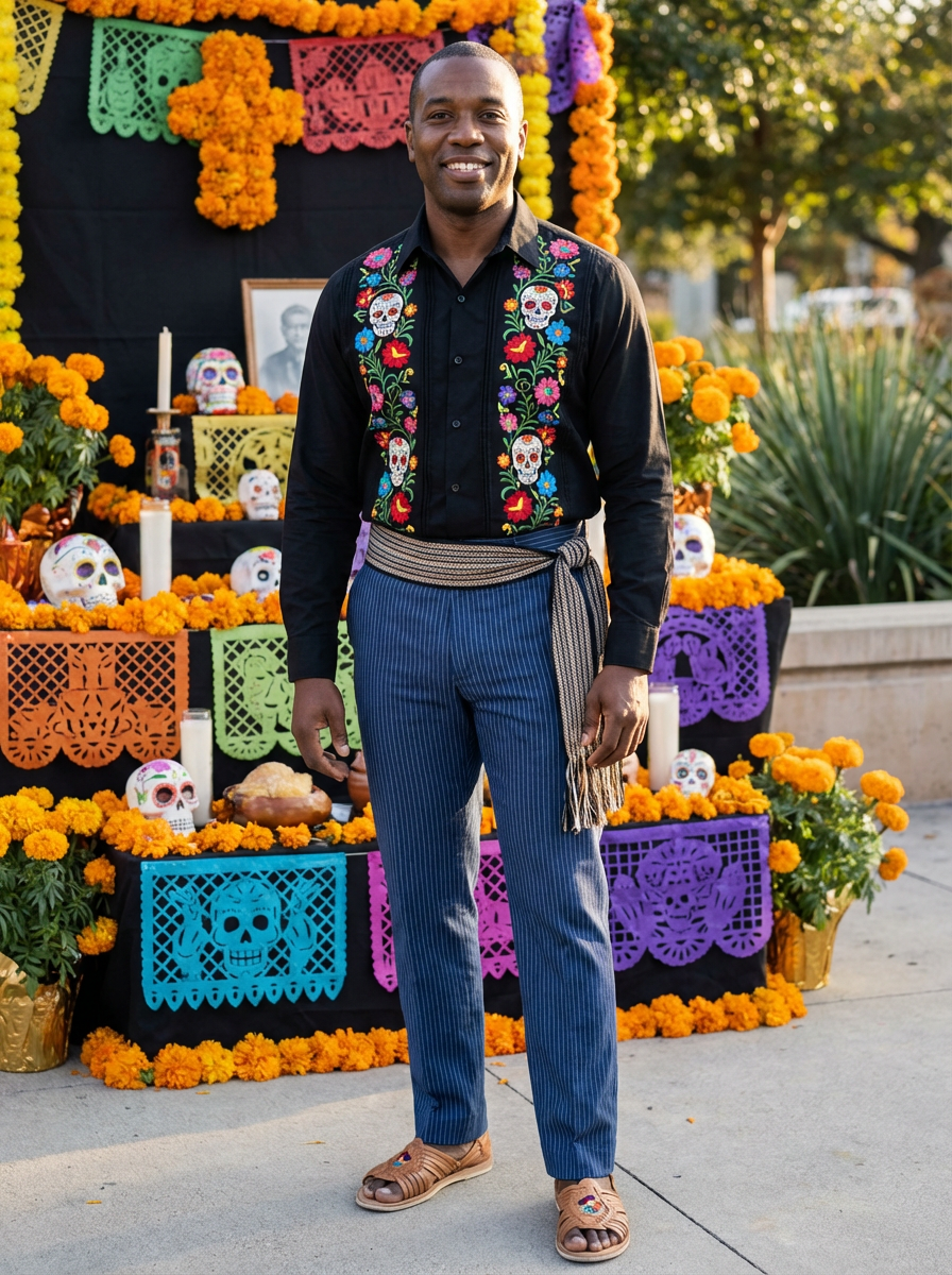 a stunning model in contemporary fashion with traditional Mexican touches, capturing their festive look against a backdrop of altars and memorial decorations