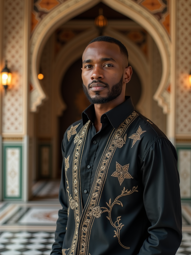 a stunning model in contemporary modest fashion with traditional touches, capturing their serene look against a backdrop of Islamic geometric patterns and Ramadan decorations
