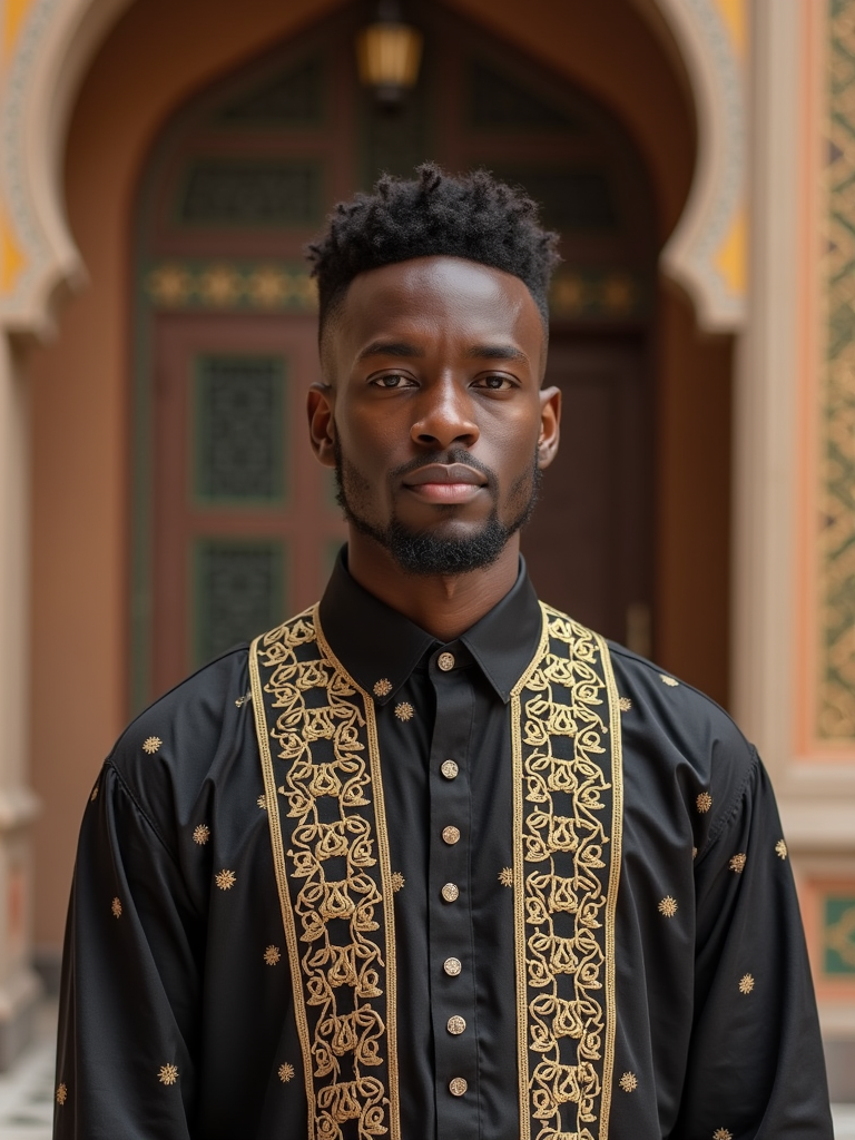 a stunning model in contemporary modest fashion with traditional touches, capturing their serene look against a backdrop of Islamic geometric patterns and Ramadan decorations