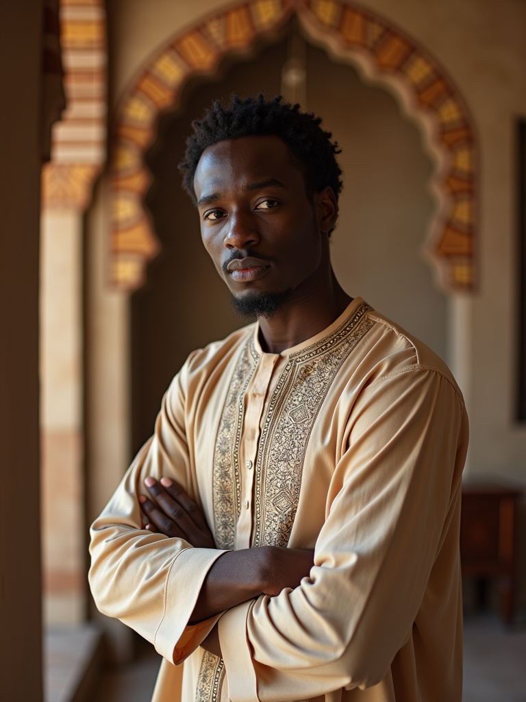 a stunning model in contemporary modest fashion with traditional touches, capturing their serene look against a backdrop of Islamic geometric patterns and Ramadan decorations
