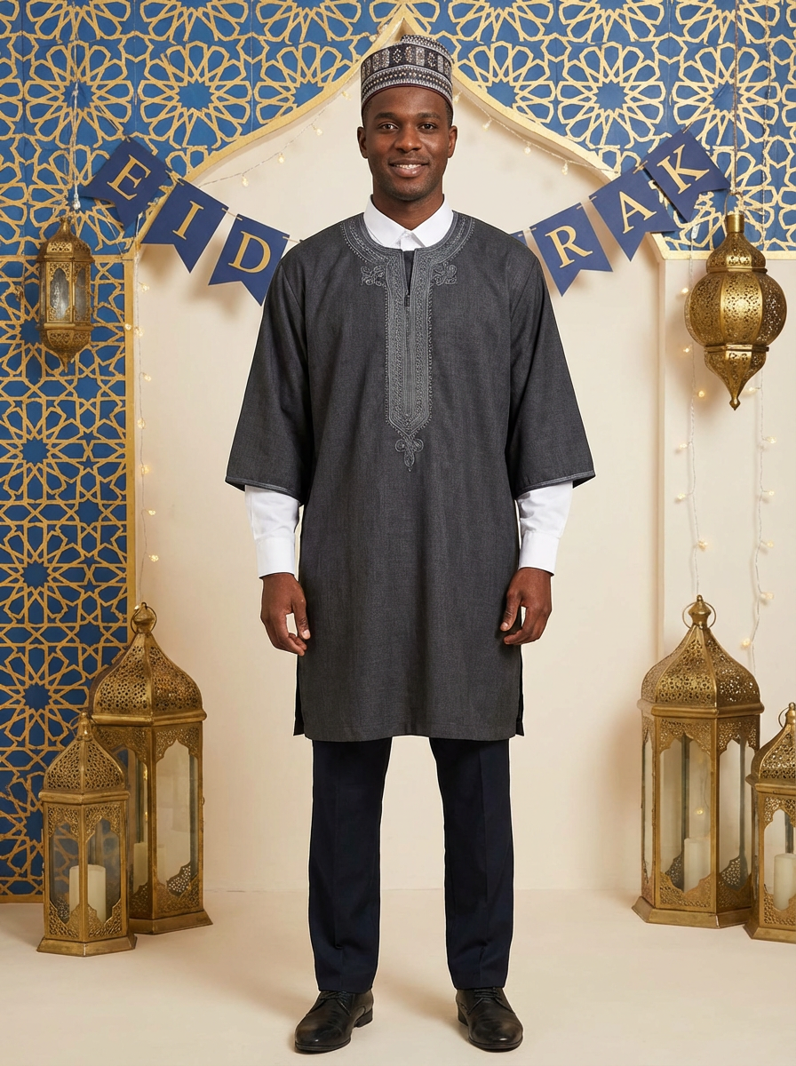 a stunning model in contemporary modest fashion with traditional touches, capturing their festive look against a backdrop of Islamic geometric patterns and Eid decorations