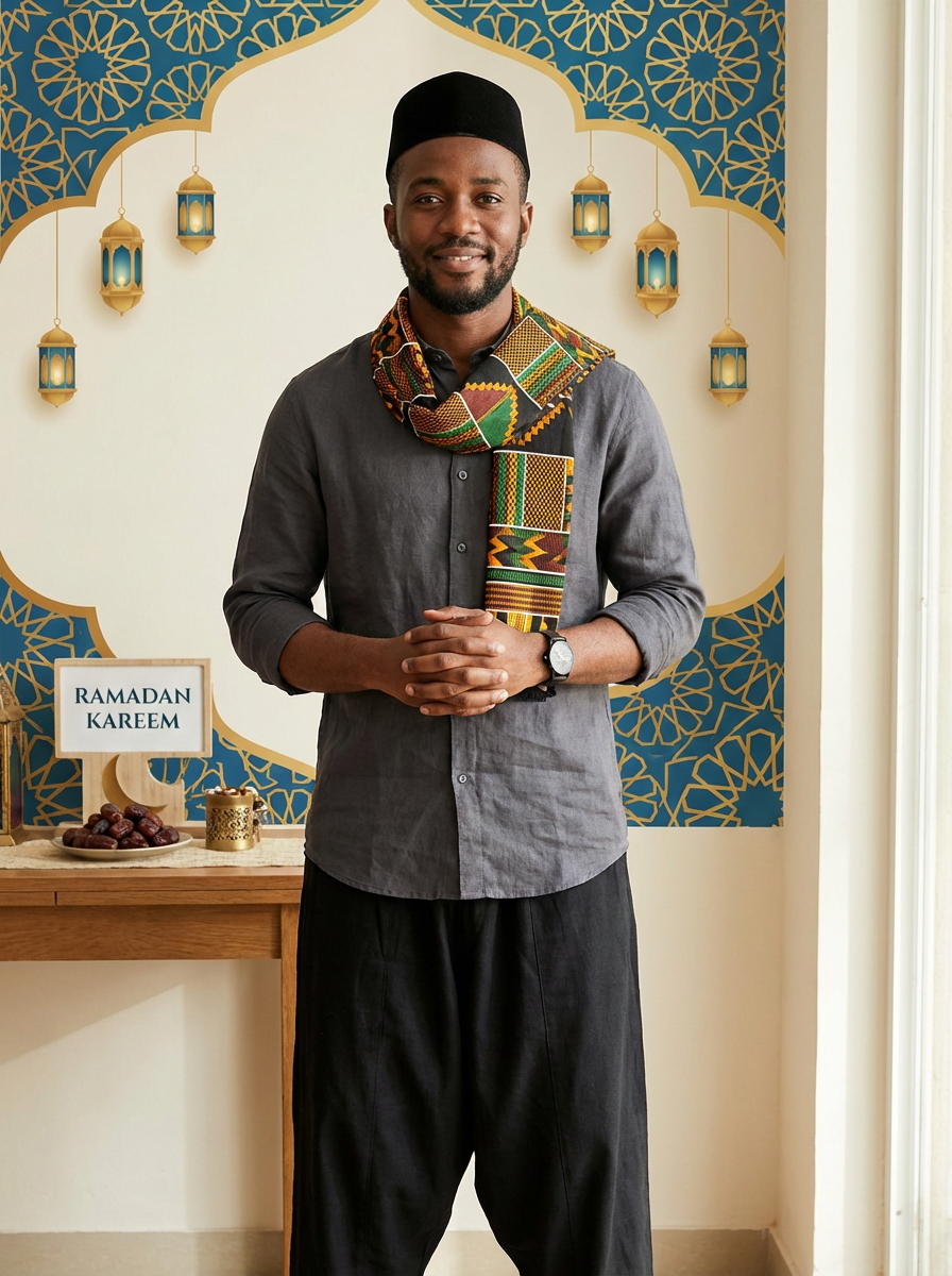 a stunning model in contemporary modest fashion with traditional touches, capturing their serene look against a backdrop of Islamic geometric patterns and Ramadan decorations