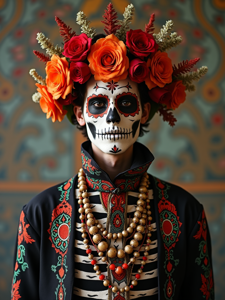 a stunning model in traditional attire with Day of the Dead symbols, embodying the remembrance and celebration of ancestors