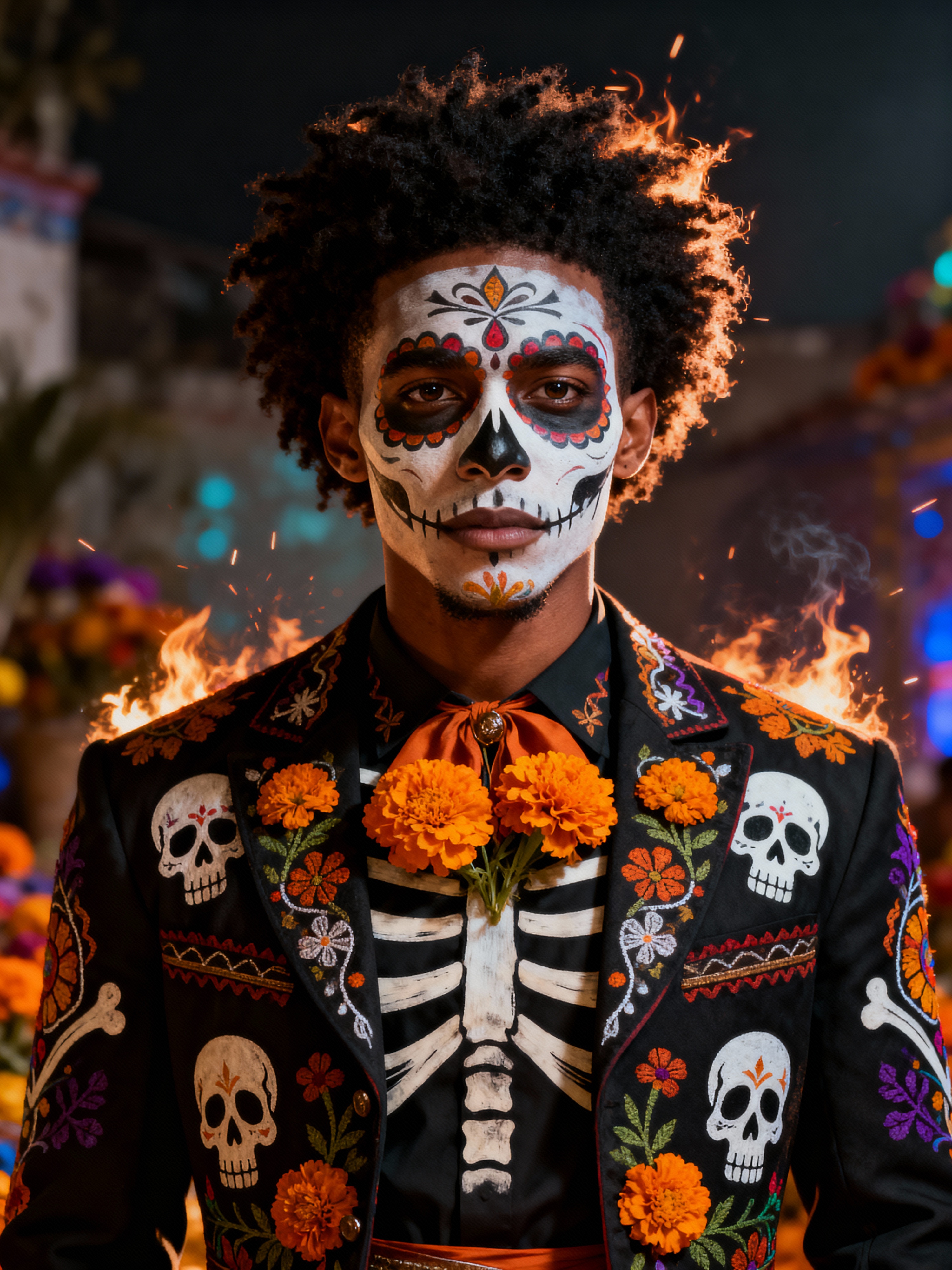 a stunning model in traditional attire with Day of the Dead symbols, embodying the remembrance and celebration of ancestors