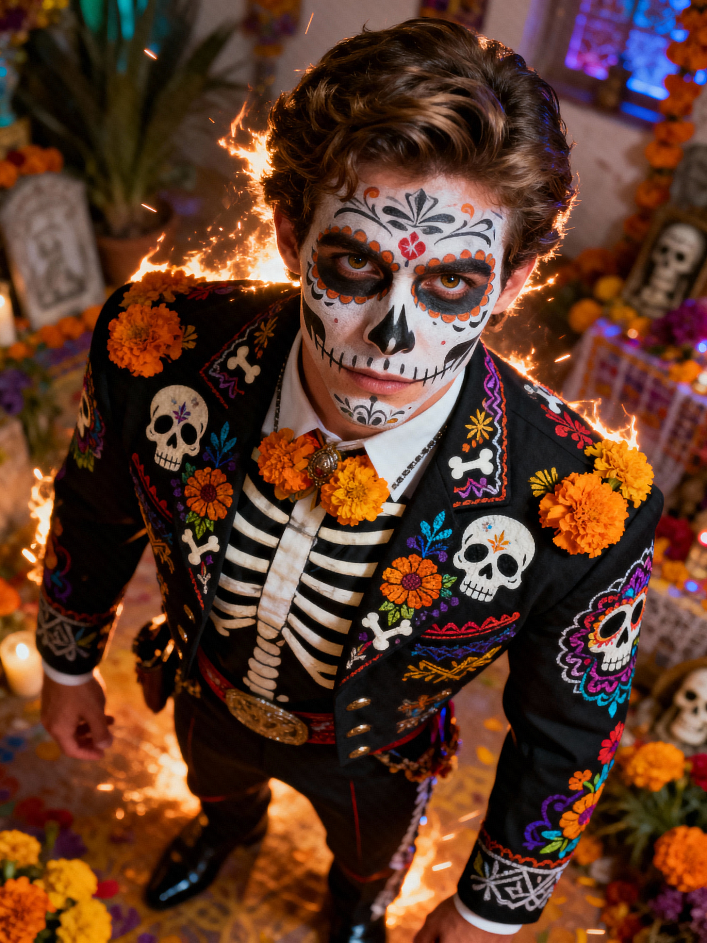 a stunning model in traditional attire with Day of the Dead symbols, embodying the remembrance and celebration of ancestors