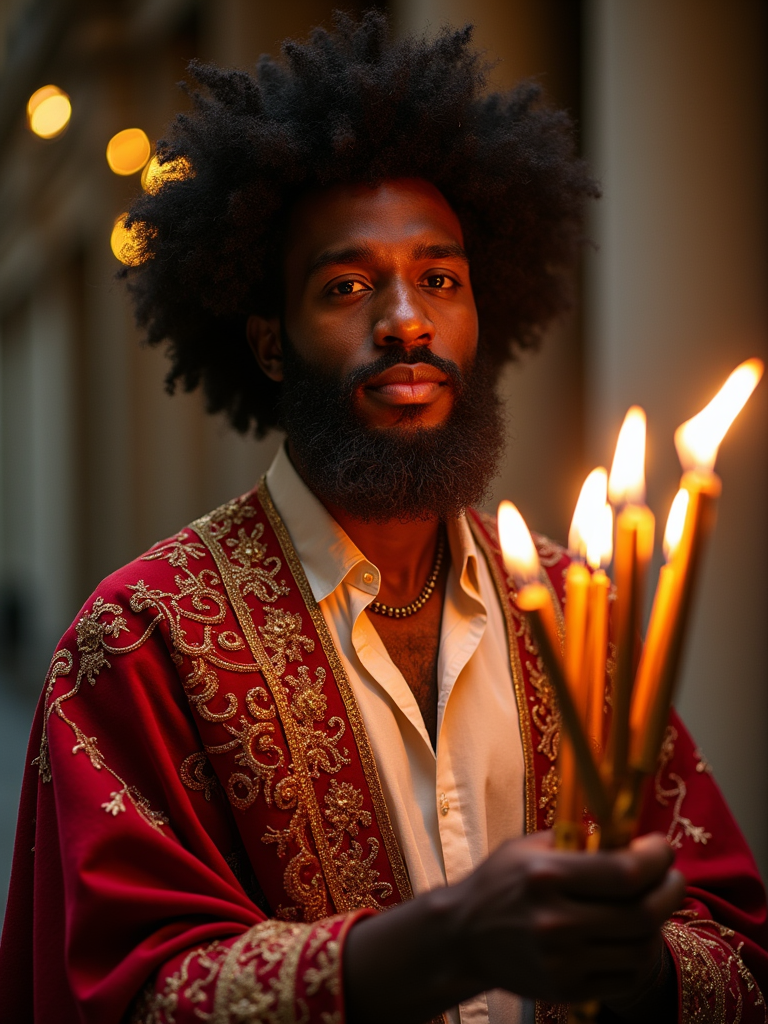 a stunning model in traditional attire with holiday symbols, embodying the resilience and faith celebrated during Hanukkah