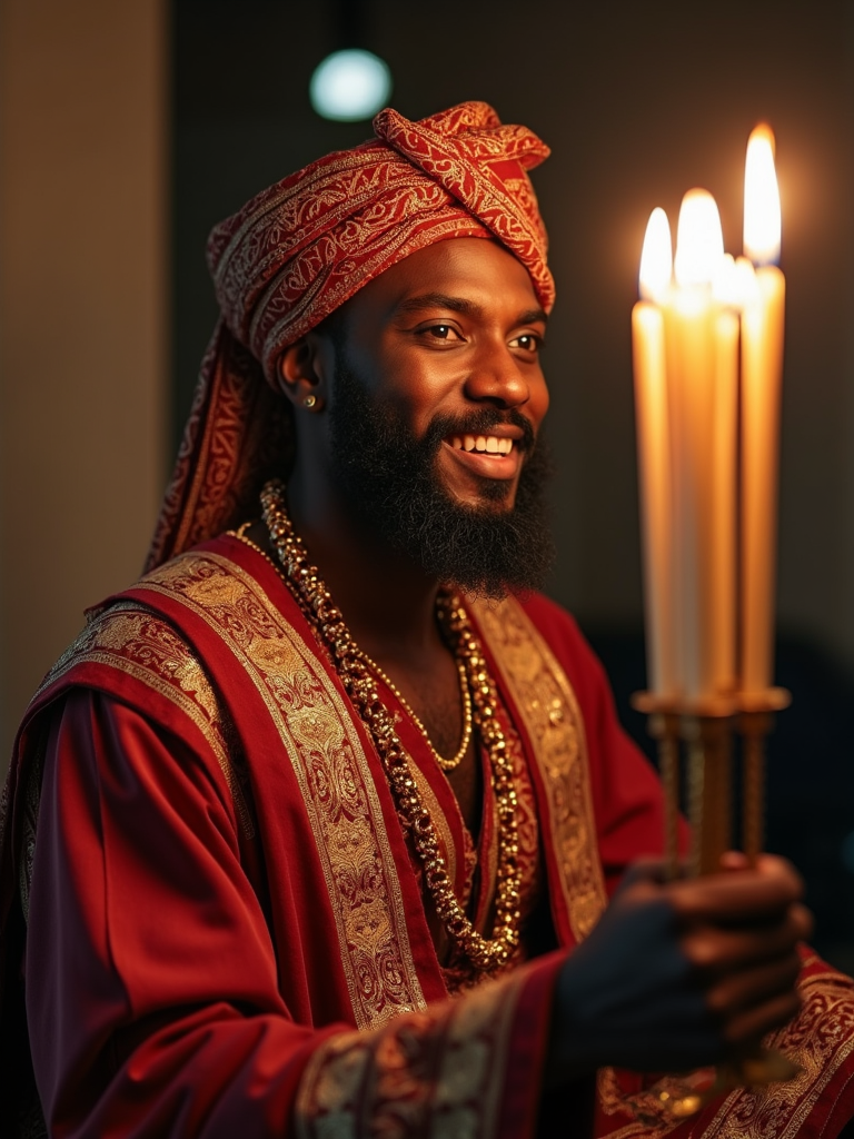 a stunning model in traditional attire with holiday symbols, embodying the resilience and faith celebrated during Hanukkah