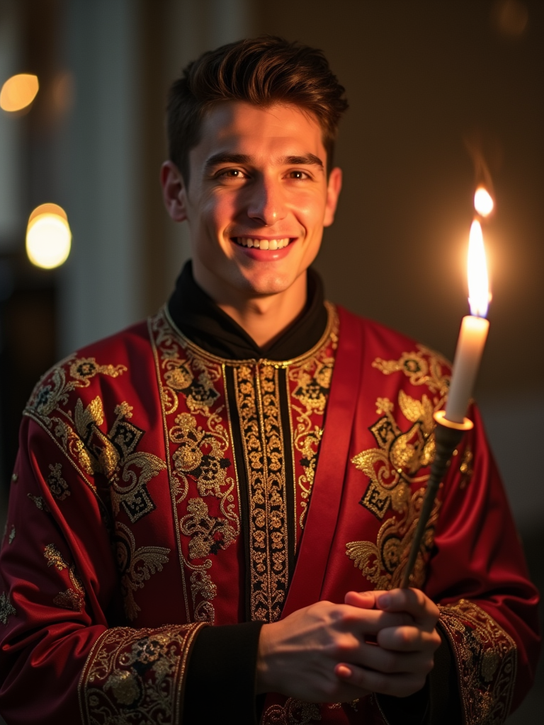 a stunning model in traditional attire with holiday symbols, embodying the resilience and faith celebrated during Hanukkah