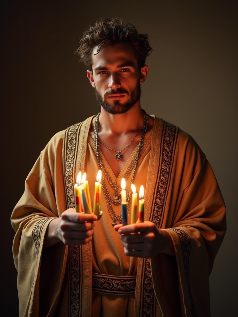 a stunning model in traditional attire with holiday symbols, embodying the resilience and faith celebrated during Hanukkah