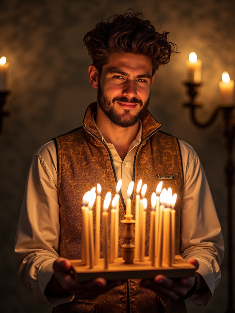 a stunning model in traditional attire with holiday symbols, embodying the resilience and faith celebrated during Hanukkah
