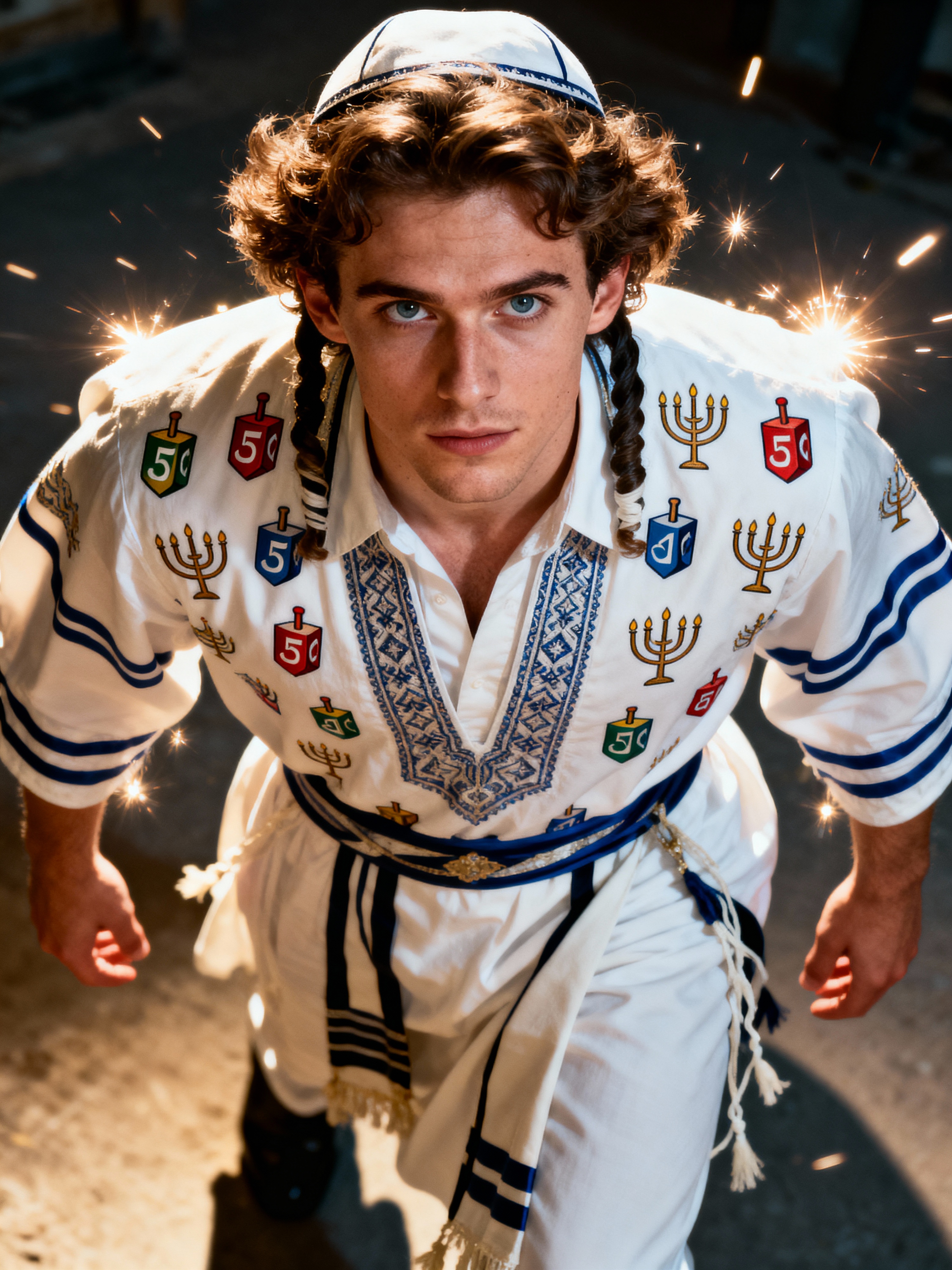 a stunning model in traditional attire with holiday symbols, embodying the resilience and faith celebrated during Hanukkah