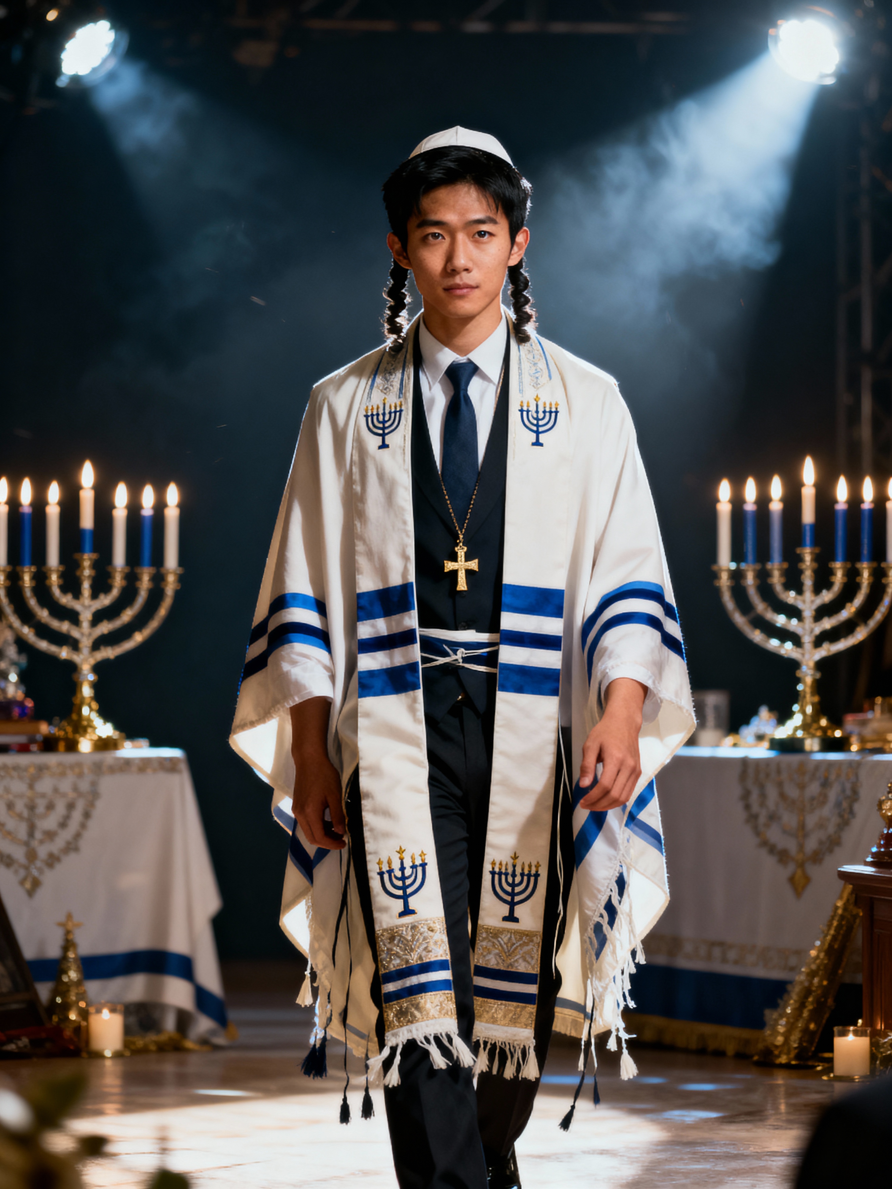 a stunning model in traditional attire with holiday symbols, embodying the resilience and faith celebrated during Hanukkah