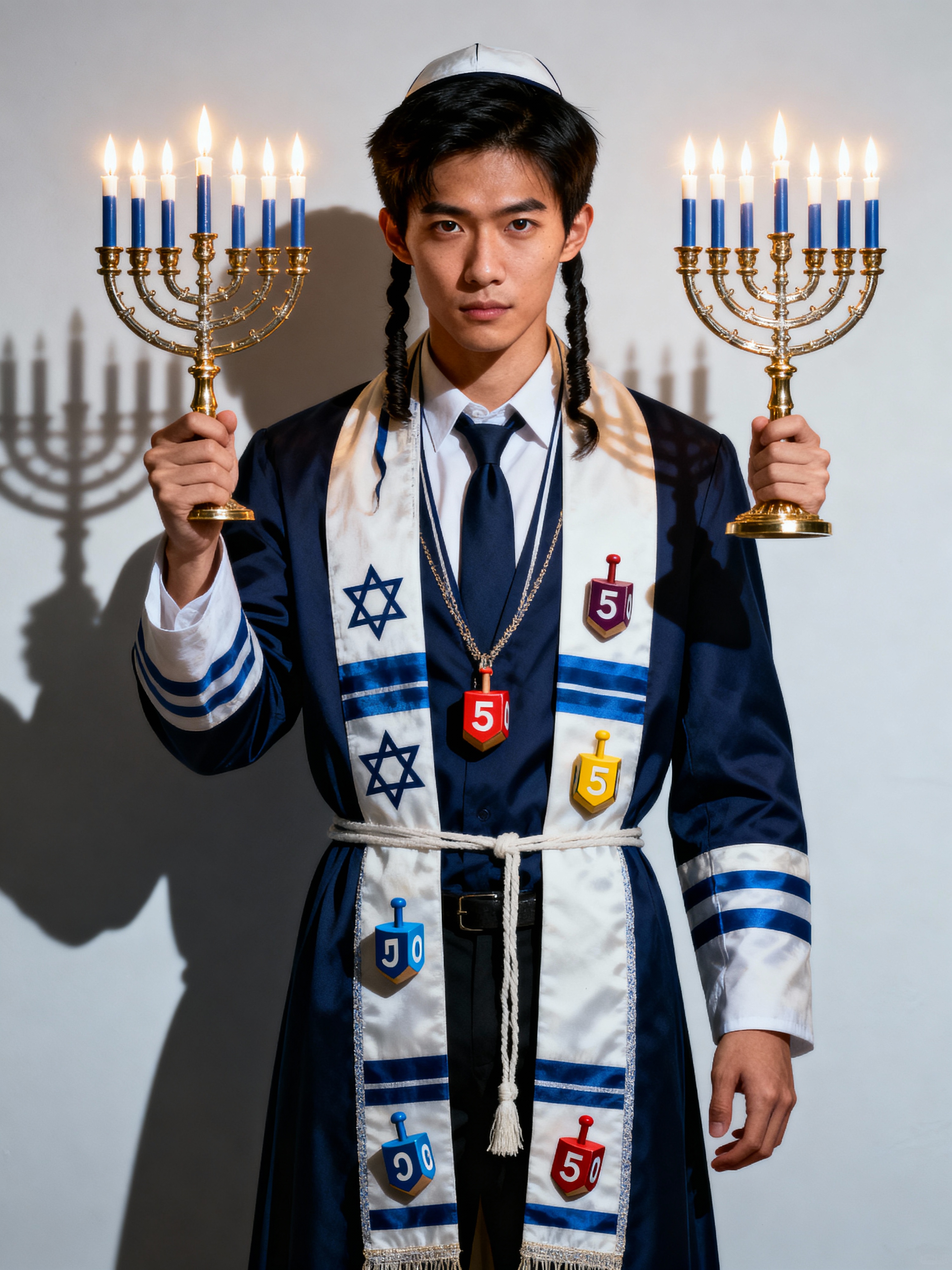 a stunning model in traditional attire with holiday symbols, embodying the resilience and faith celebrated during Hanukkah