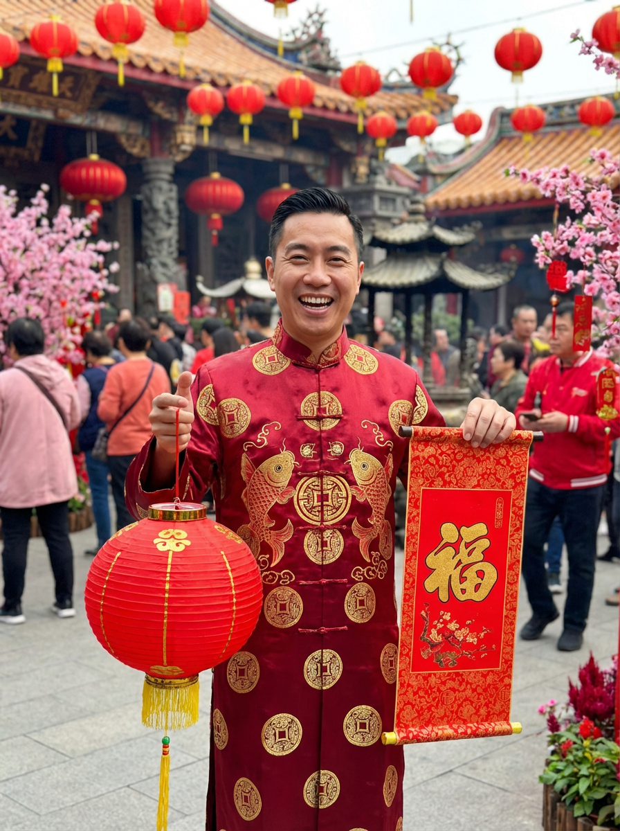 a stunning model in traditional attire with prosperity symbols, embodying the hope and new beginnings of the Lunar Chinese New Year