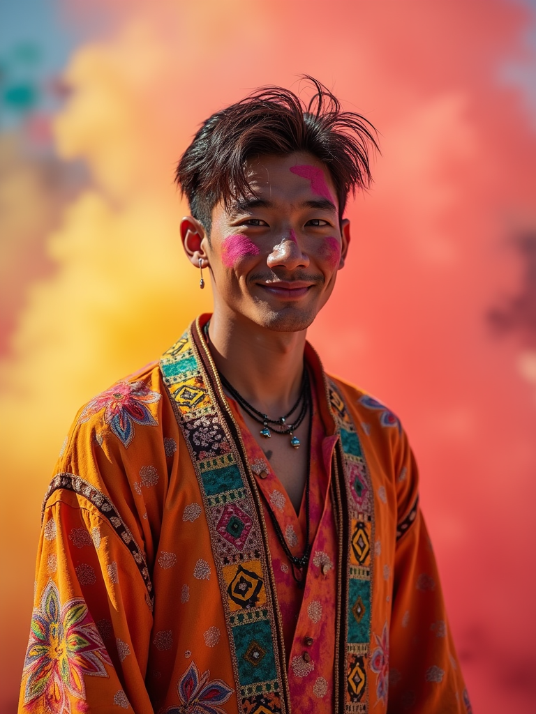 a stunning model in traditional clothes now painted with festival colors, capturing their eclectic and vibrant look against a backdrop of color explosions