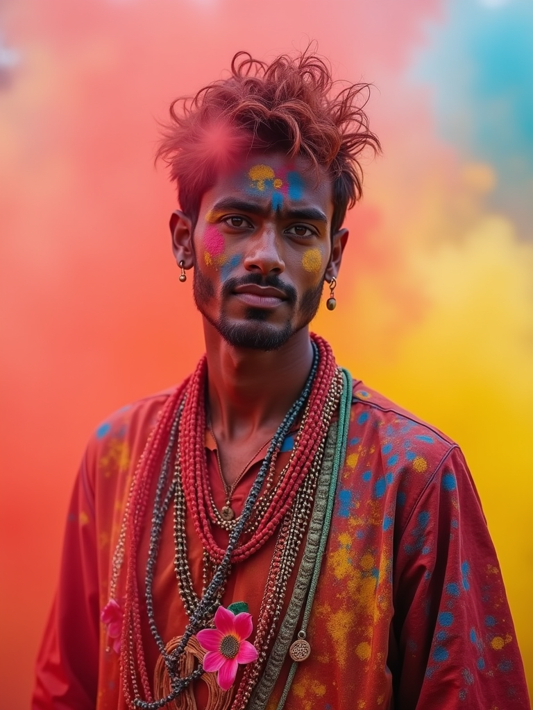 a stunning model in traditional clothes now painted with festival colors, capturing their eclectic and vibrant look against a backdrop of color explosions