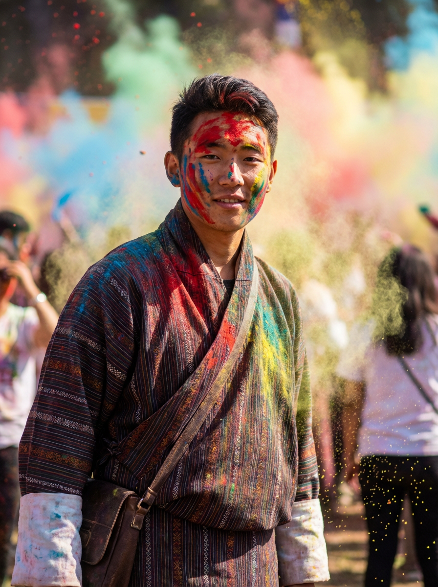 a stunning model in traditional clothes now painted with festival colors, capturing their eclectic and vibrant look against a backdrop of color explosions