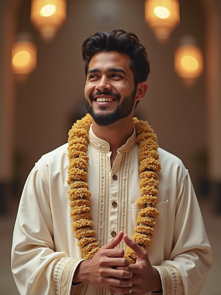 a stunning model in traditional Eid attire, embodying the joy and gratitude at the culmination of Ramadan