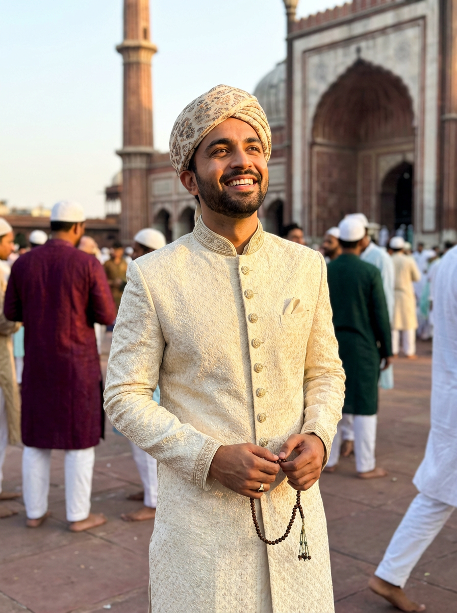 a stunning model in traditional Eid attire, embodying the joy and gratitude at the culmination of Ramadan