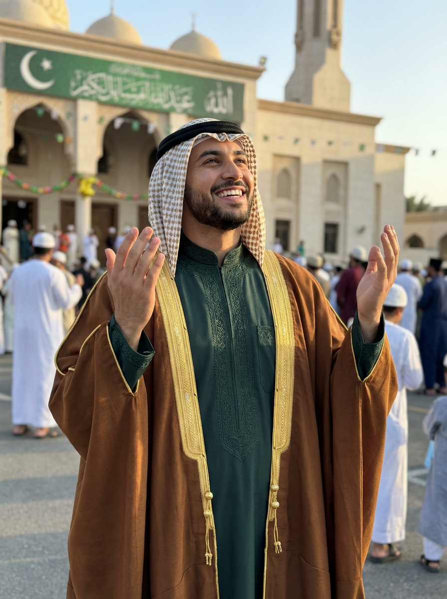 a stunning model in traditional Eid attire, embodying the joy and gratitude at the culmination of Ramadan