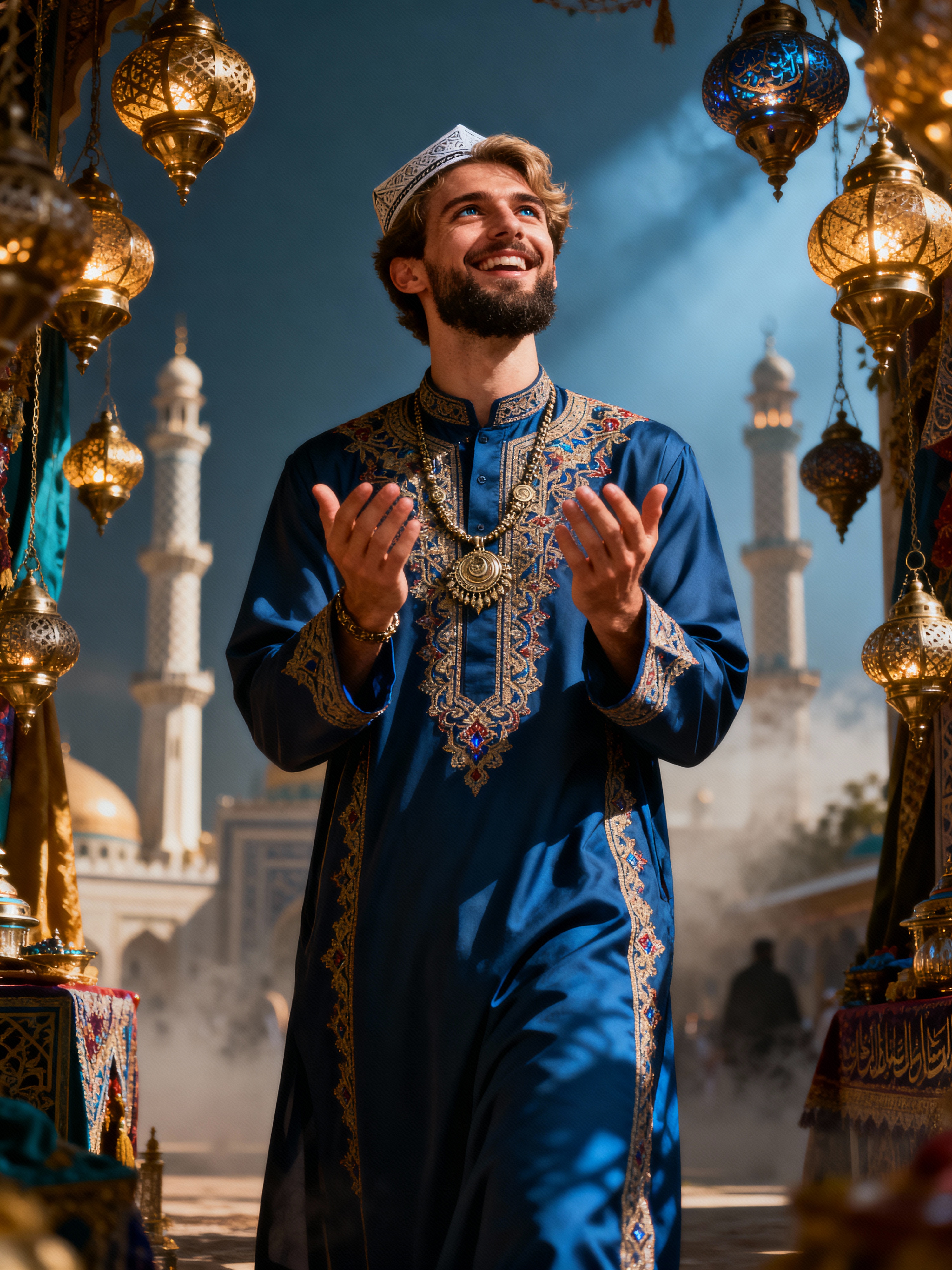 a stunning model in traditional Eid attire, embodying the joy and gratitude of the holiday