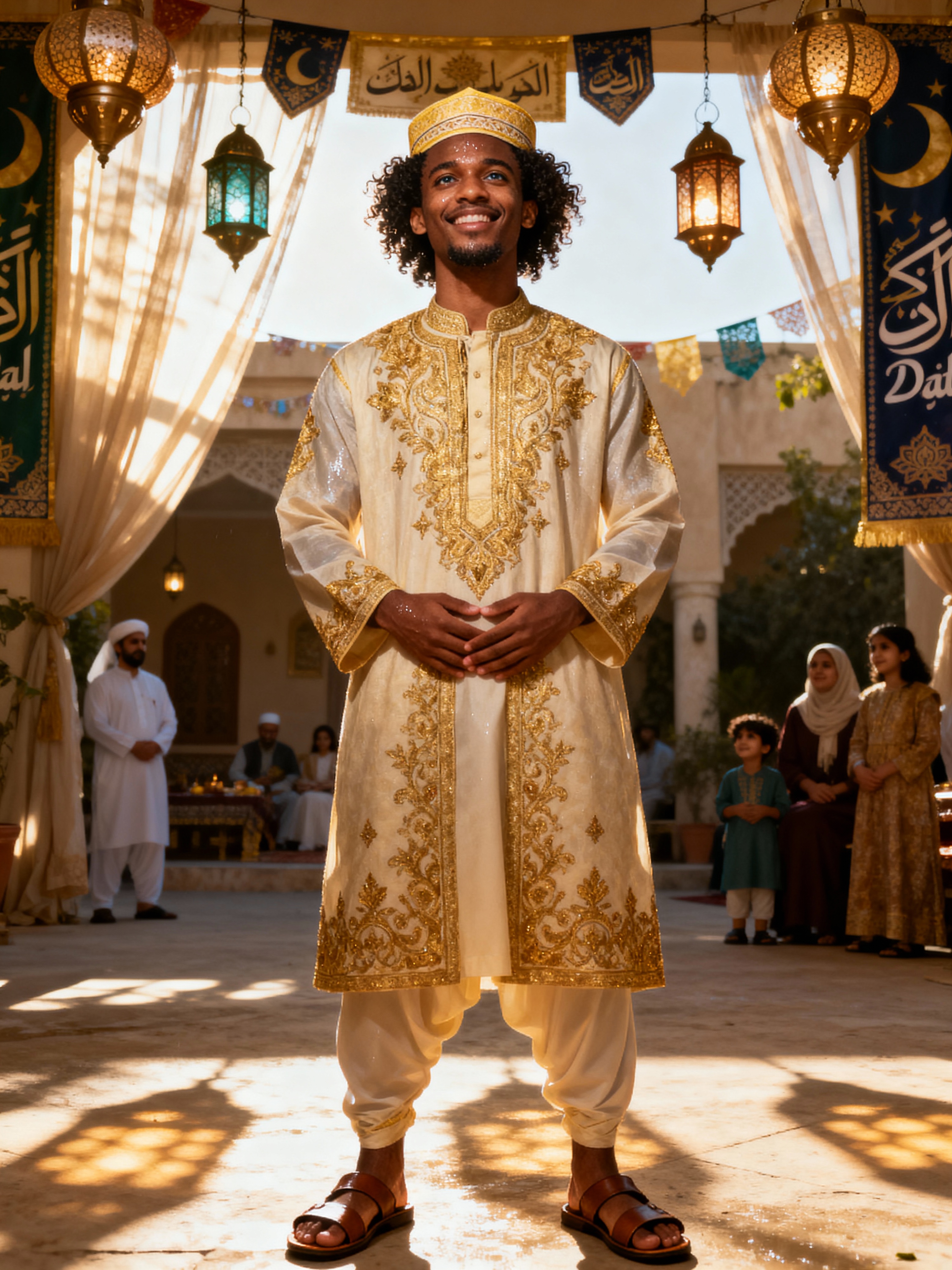 a stunning model in traditional Eid attire, embodying the joy and gratitude of the holiday