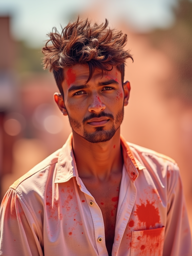 a stunning model in white clothes now stained with festival pigments, embodying the transformation and renewal symbolism of the Holi festival