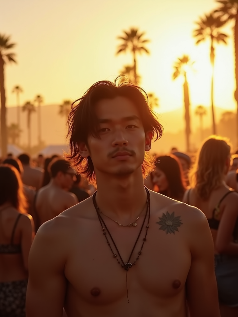 a stunning model surrounded by a crowd of festival-goers, capturing the sense of community and celebration at Coachella as the sun sets over the palm trees