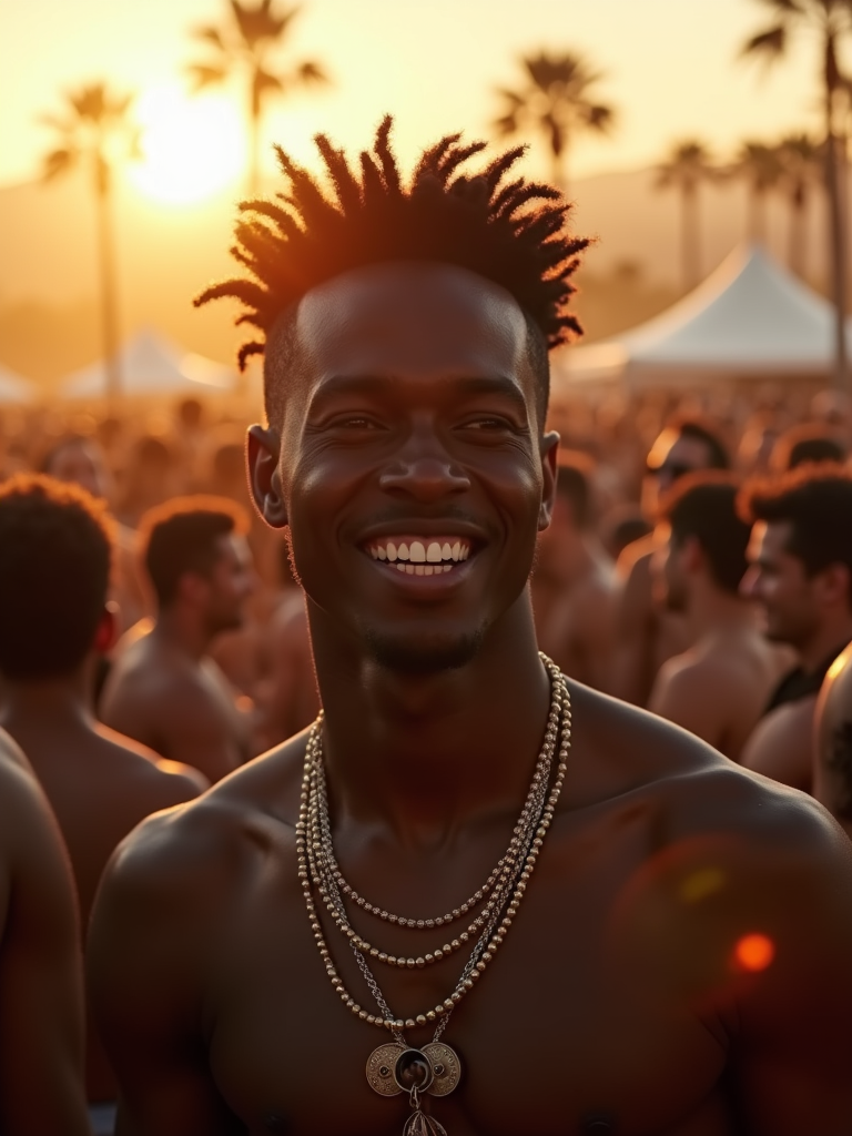 a stunning model surrounded by a crowd of festival-goers, capturing the sense of community and celebration at Coachella as the sun sets over the palm trees